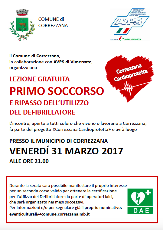 L'incontro è aperto a tutti residenti nel Comune di Correzzana e a coloro che vi lavorano. I partecipanti interessati potranno fare la preiscrizione al corso di BLSD laico che verrà organizzato prossimamente nel comune.